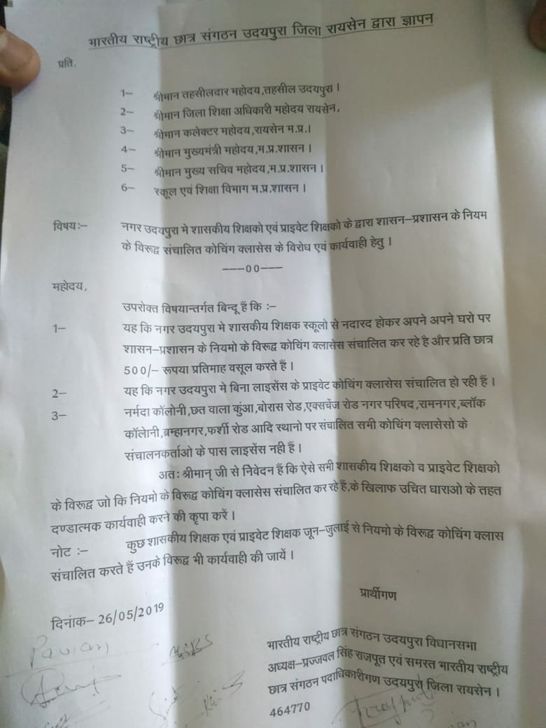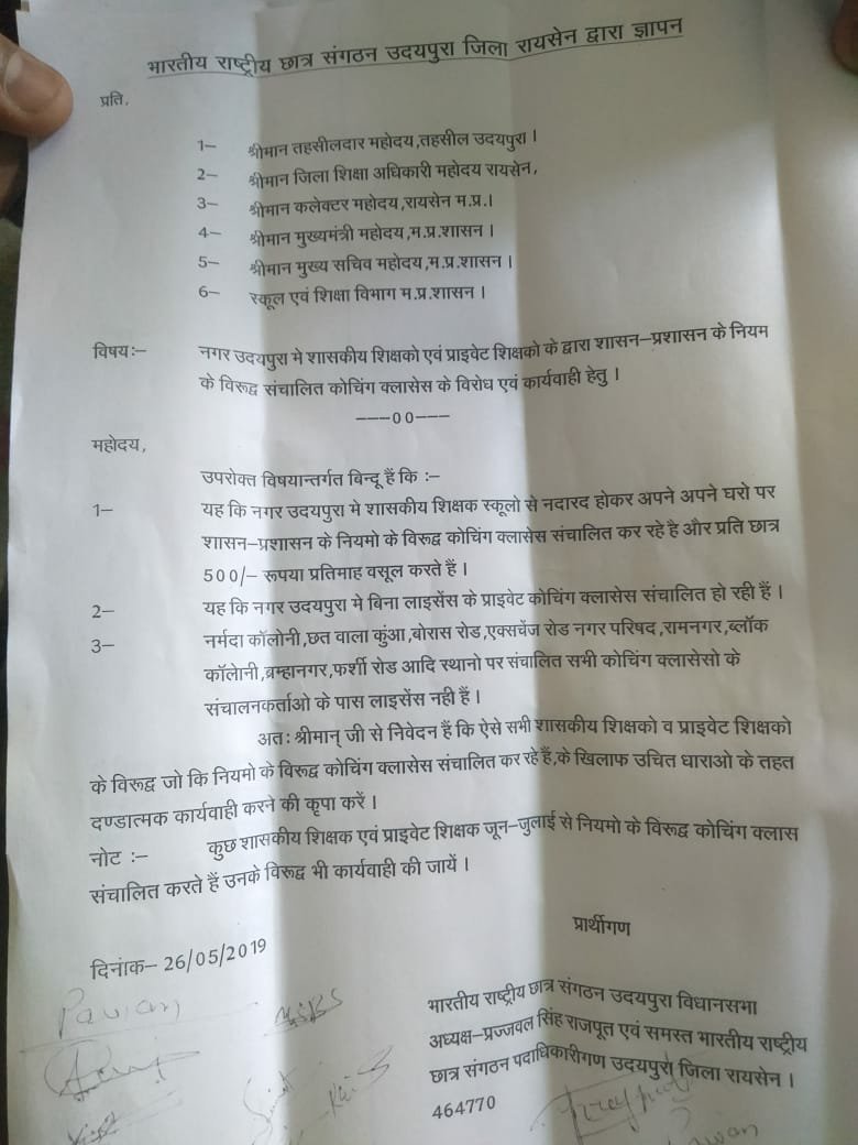 आज एनएसयूआई उदयपुरा ने अवैध कोचिंग संचालकों के विरुद्ध तहसीलदार महोदय उदयपुर, जिला शिक्षा अधिकारी महोदय रायसेन, कलेक्टर महोदय रायसेन, मुख्यमंत्री मध्यप्रदेश शासन, मुख्य सचिव मध्यप्रदेश शासन, स्कूल एवं शिक्षा विभाग मध्यप्रदेश शासन के नाम सौंपा ज्ञापन और उचित धाराओं के तहत दंडात्मक कार्रवाई करने अपील की।