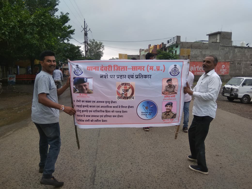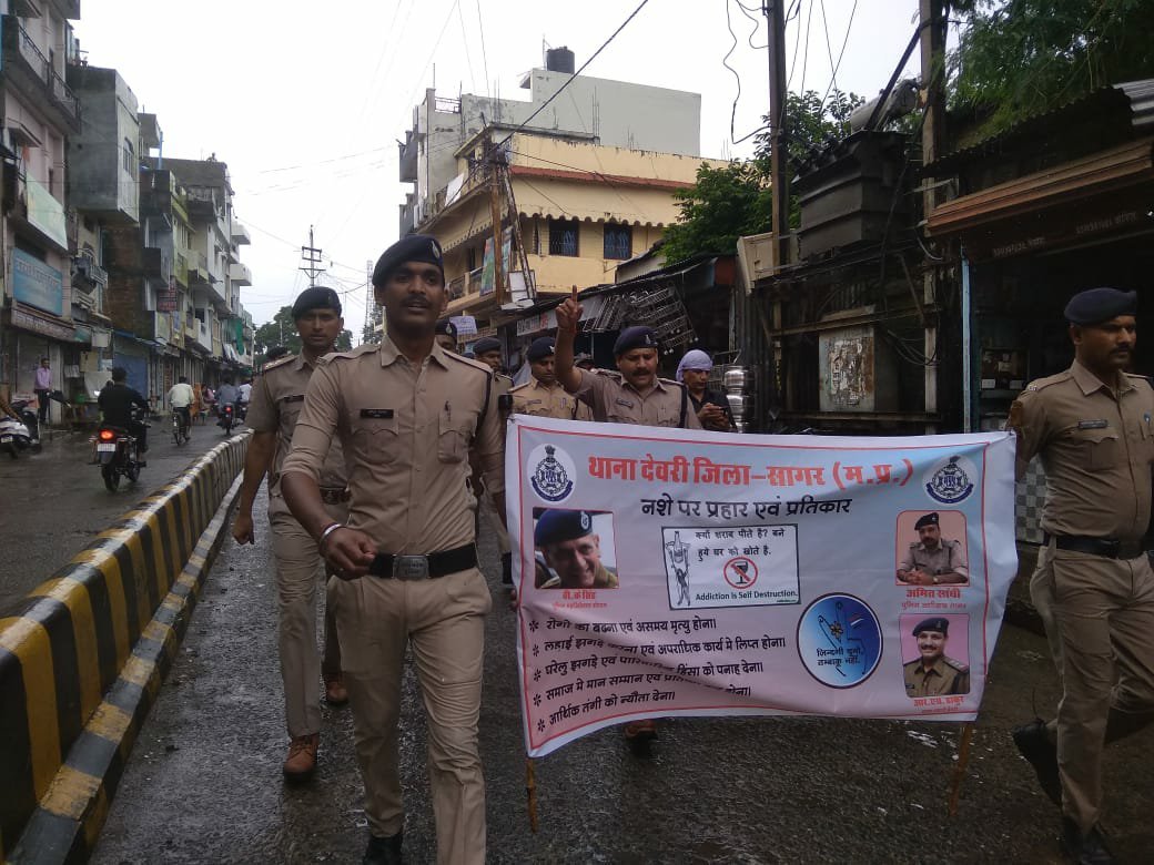 रविवार को थाना प्रभारी आर एस ठाकुर की अगुवाई में देवरी पुलिस ने कस्बे में पुलिस बल व एन सी सी के कैरेड्स, नगर रक्षा समिति के सदस्यों के साथ नशा मुक्ति जन चेतना रैली निकाल कर आमजन से नशे से दूर रहने का आह्वान किया। रैली का शुभारंभ थाना परिसर से शुरू होकर कस्बे के मुख्य मुख्य मार्गो से होते हुए नगर पालिका चौराहा, बस स्टैंड से होते हुए पुलिस थाना पर समापन हुआ। नशा मुक्ति रैली को बारिश का सामना भी करना पड़ा परंतु बारिश में भी सभी लोग डटे रहे। हाथों में नशा मुक्ति अभियान के स्लोगन लिखी तख्तियां लेकर सभी लोग चल रहे थे।